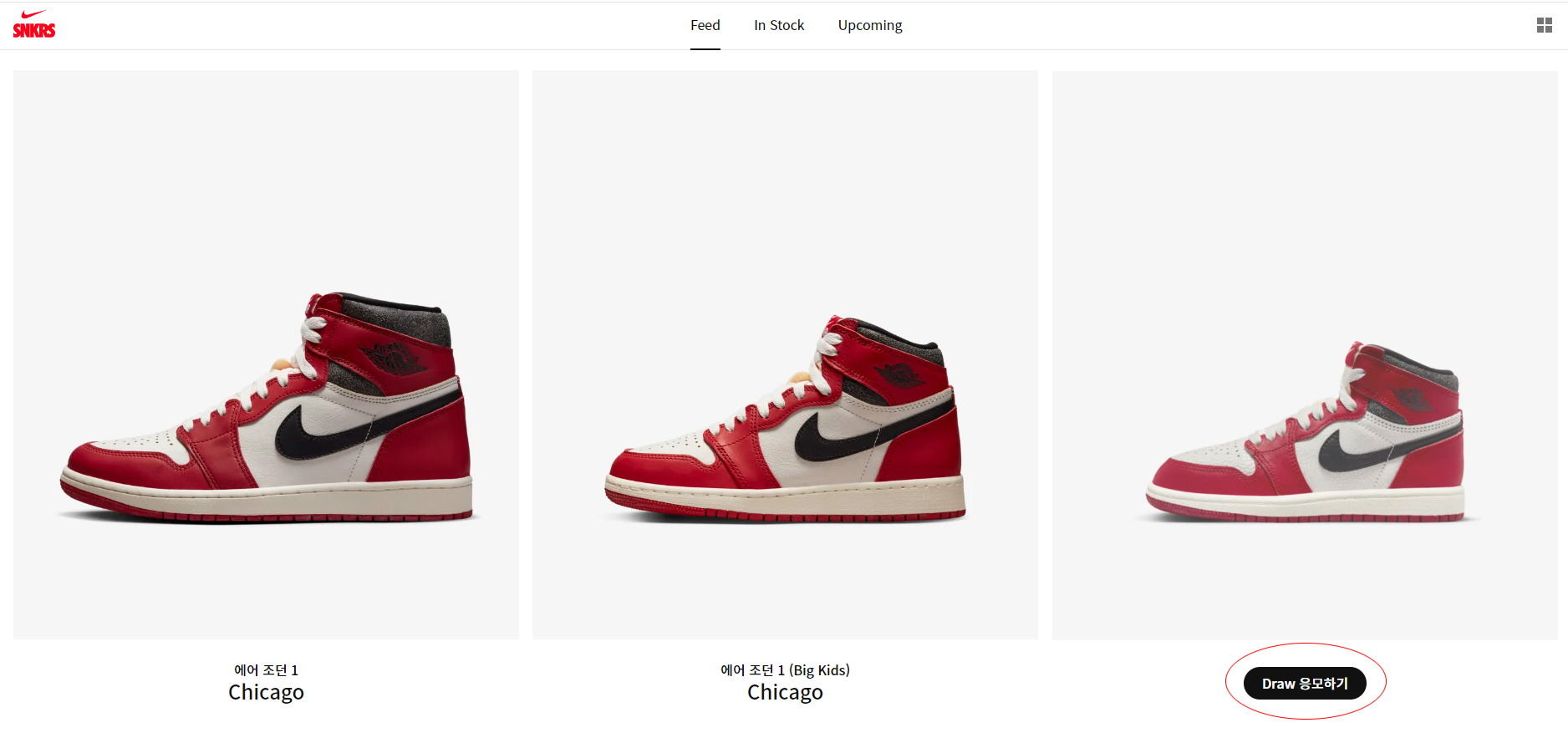 드로우 같은 경우는 원하는 신발에 마우스를 대면 나오는 'Draw 응모하기' 를 눌러주세요!