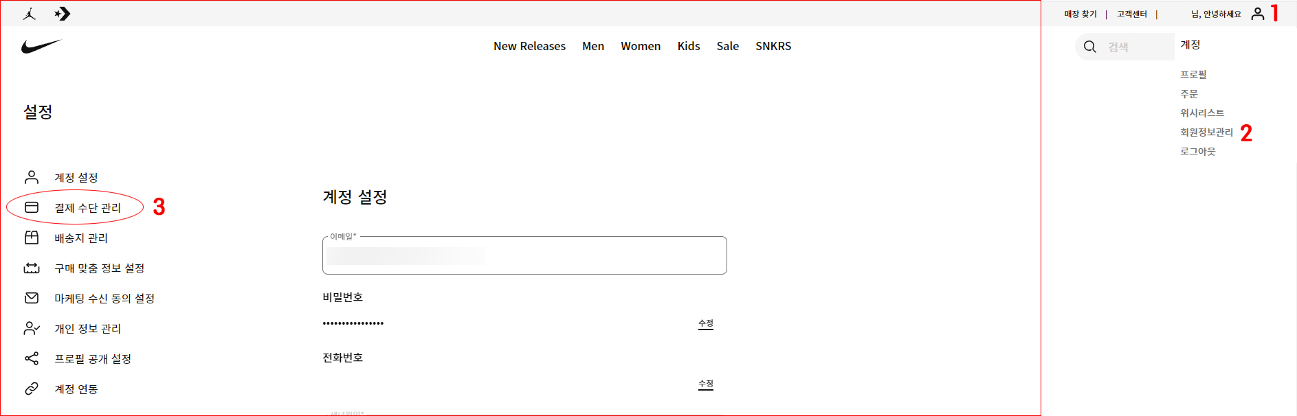 사이트에 들어가면 사진 우측 위 1번 누르시고 2번 (회원정보관리) 누르시면 왼쪽 빨간 네모 처럼 창이 뜰겁니다!