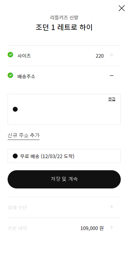 클릭하면 왼쪽 처럼 창이 나올건데 클릭한 사이즈와 계정에 저장되어있는 주소가 뜹니다!