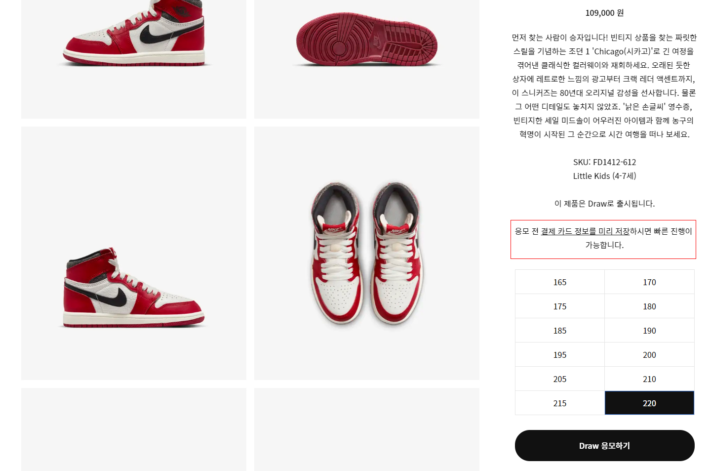 원하는 사이즈를 클릭하고 'Draw 응모하기'를 누르세요!
