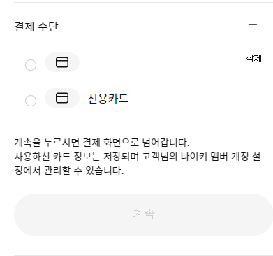 저장 및 계속을 누르시면 우측처럼 결제 수단이 나오는데! 등록한 카드를 누르고 계속을 누르면